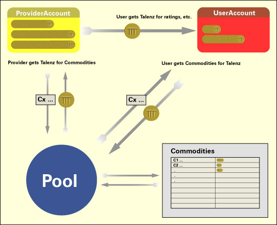 - Pool account (the service provider's total of all commodities in circulation, which is to control whether the talenz system is still backed up with commodities)